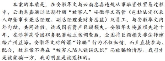 而在金龙鱼召开的11月21日召开的投资者说明会中,房彦江坚称广州益海被冤枉。房彦江称,本案的本质是,在安徽华文与云南惠嘉违规从事融资性贸易过程中,云南惠嘉通过长期行贿“被害人”安徽华文高管及员工,与安徽华文内外勾结、共同造假,造成国有资产巨额损失。安徽华文掩盖损失近十年,在涉事高管因职务犯罪被立案调查后,企图将巨额损失非法转嫁给广州益海。安徽华文对所谓“诈骗”行为不仅知情,而且直接参与、配合,故本案不存在“被害人陷入错误认识”而被骗的情形。“我司才是被蒙骗一方。”